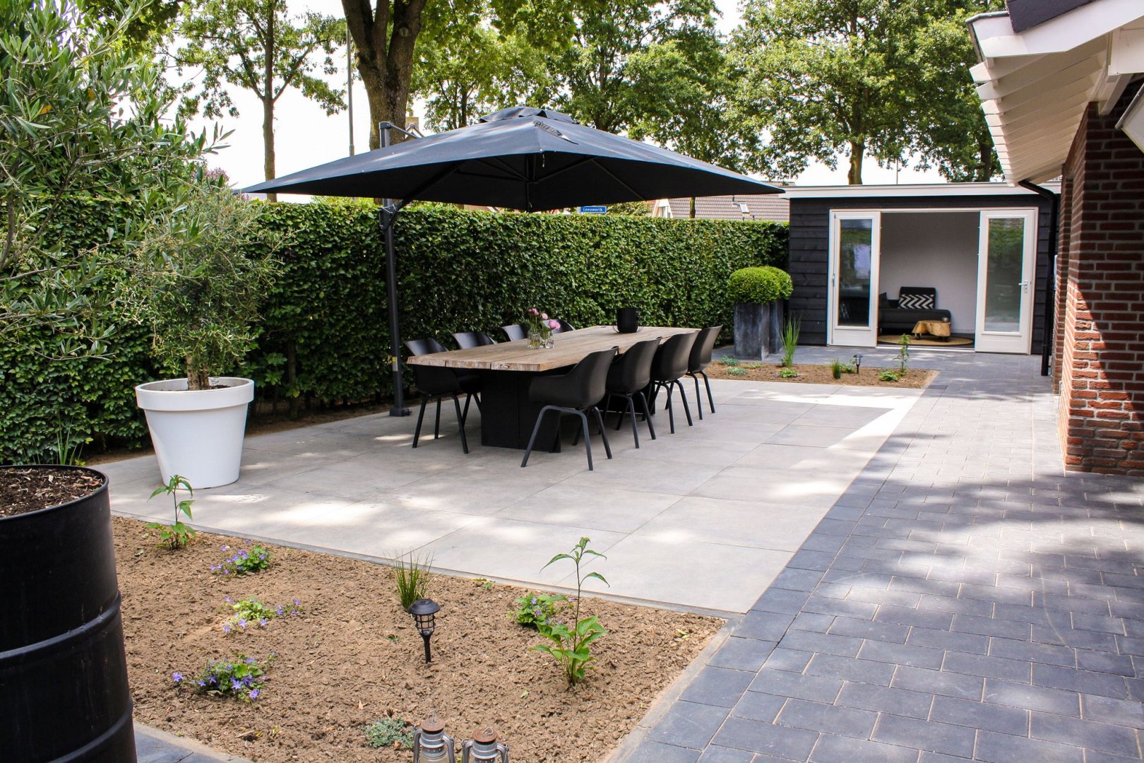 Wat een strakke en sfeervolle tuin!☀️ Dit voorjaar aangelegd en helemaal klaar voor gebruik. Met de opdracht "we willen geen kleine steentjes" samen opzoek gegaan naar passende materialen, een terrastegel van 90x90 in combinatie met een donkere 20x30 steen voor in de paden is dat goed gelukt!