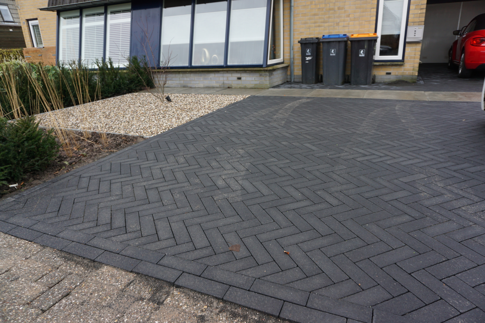 Op advies van de hovenier zijn deze bewoners op afspraak naar onze showtuin gekomen. Onder het genot van een kopje koffie hebben wij samen het gehele ontwerp doorgenomen en alle producteigenschappen besproken, zodat er een passend verwachtingspatroon is gecreëerd. De keuze is gevallen op een strakke beton dikformaat met een kleurechte deklaag. Om deze grote oprit te breken hebben wij voor grote elementen gekozen in een contrasterende kleur. Het mooie van dit type tegel is dat er een ruim aanbod is in verschillende grote formaten.
