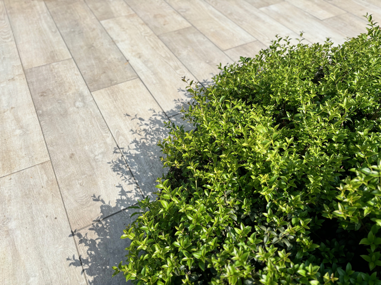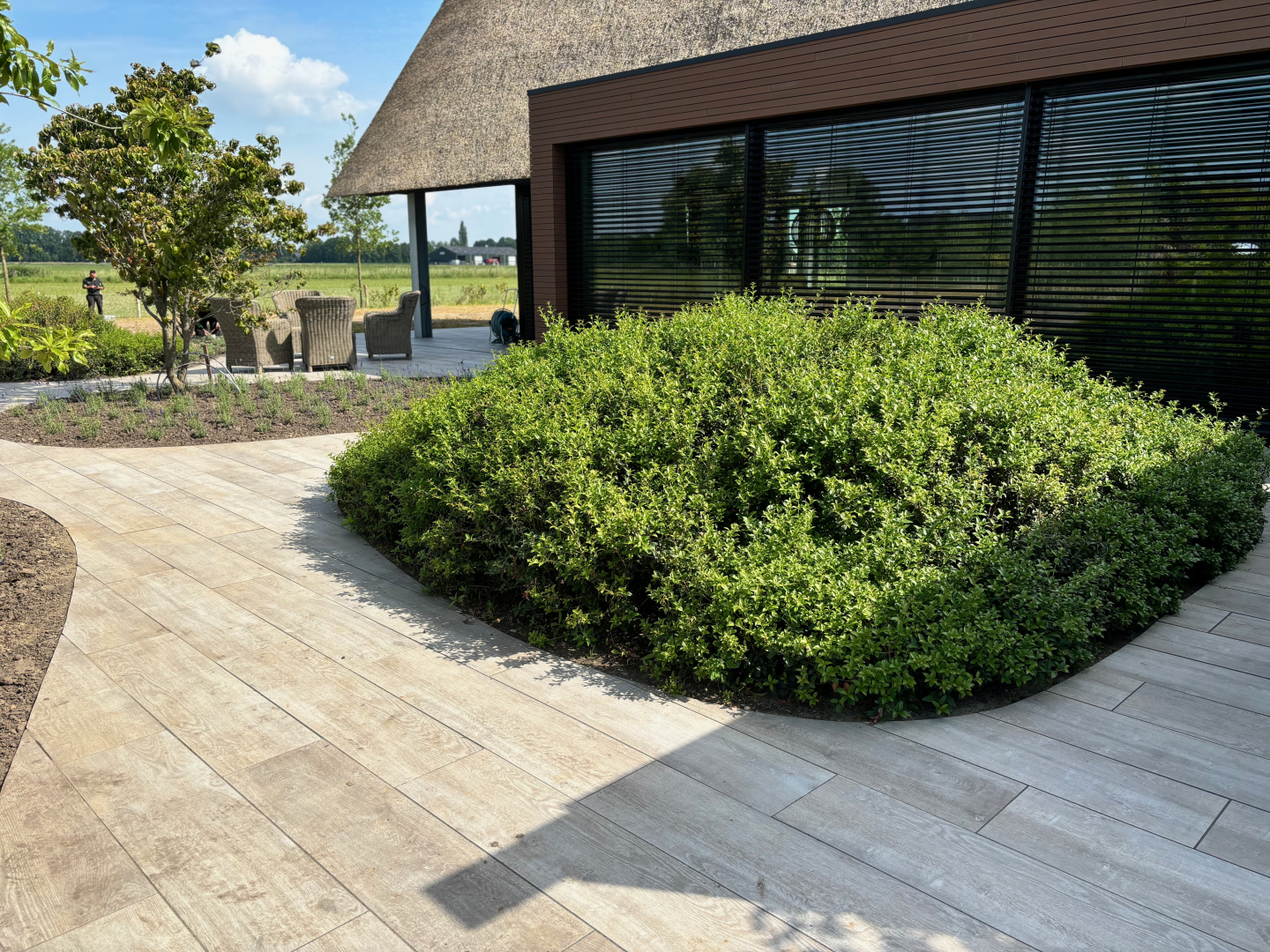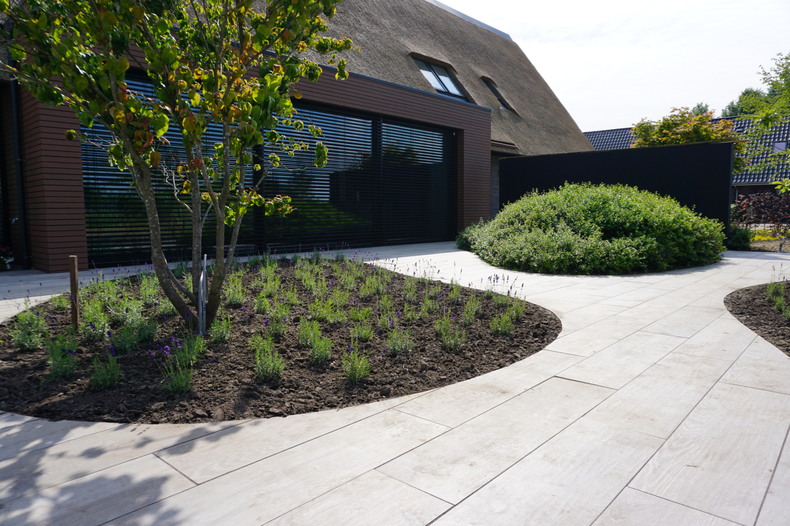 Bij deze nieuwbouwwoning is gekozen voor een opvallend tuinontwerp vol met rondingen en ovale vormen. De houtlook tegels uit de GeoCeramica serie spelen hier een centrale rol. Het was een beetje zaagwerk, maar het resultaat mag er zijn!