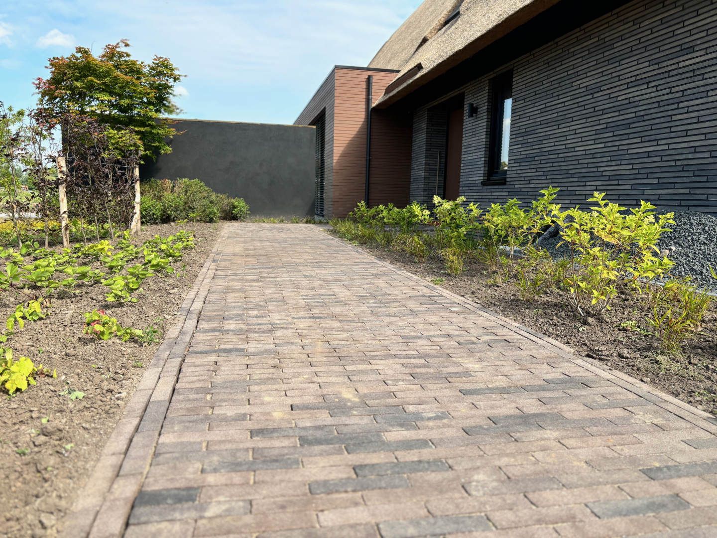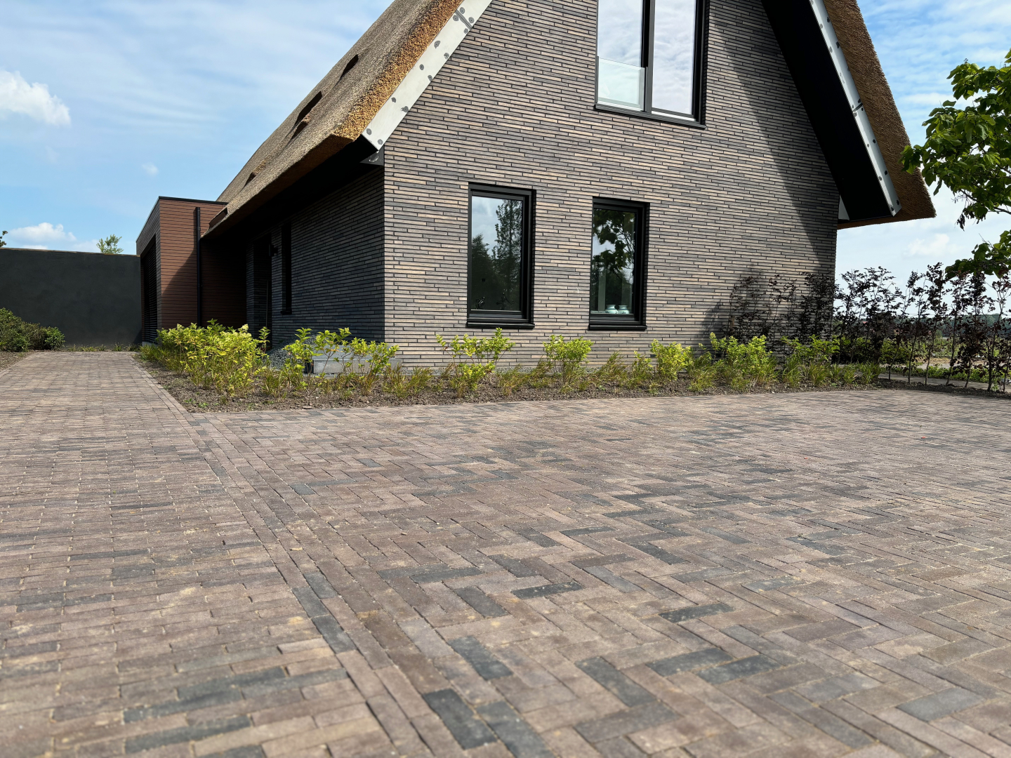 Zowel de klinkers die gebruikt zijn voor de oprit als de paden rondom de woning matchen goed met de gevel en het riet.