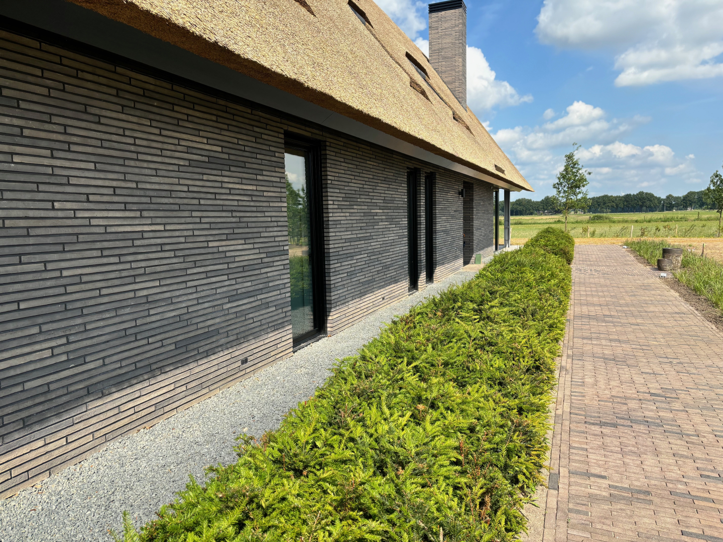 Zowel de klinkers die gebruikt zijn voor de oprit als de paden rondom de woning matchen goed met de gevel en het riet.