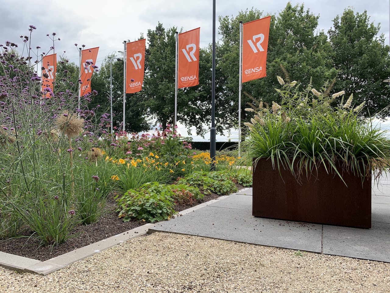Bij Rensa hebben wij 100x100x5 Schellevis tegels antraciet en Lava split geleverd. De Schellevis tegels zijn zowel geschikt voor een moderne als de nostalgische tuin. De kleur, vorm en uitstraling van de Schellevis tegels is geschikt voor opritten, pleinen en terrassen. Lava split is een gesteente dat op verschillende manieren toegepast kan worden. Van het opvullen van een plantenbak tot het aanleggen van een looppad. Bij Rensa is gebruik gemaakt van Prairie Garden, een stabiel systeem dat weinig tot geen onkruid toelaat omdat de planten diepgeworteld zijn. De bovenste laag wordt afgedekt met Lava split. Lava spit houdt onkruid tegen en is zeer goed waterdoorlatend. Daardoor is de Prairie Garden goed bestand tegen extreme regenval en in droge periodes voorkomt het Lava spit juist uitdroging van de grond en de prairieplanten.