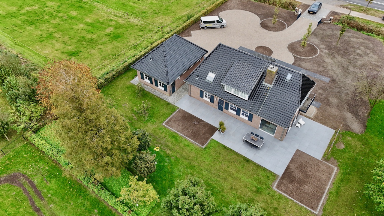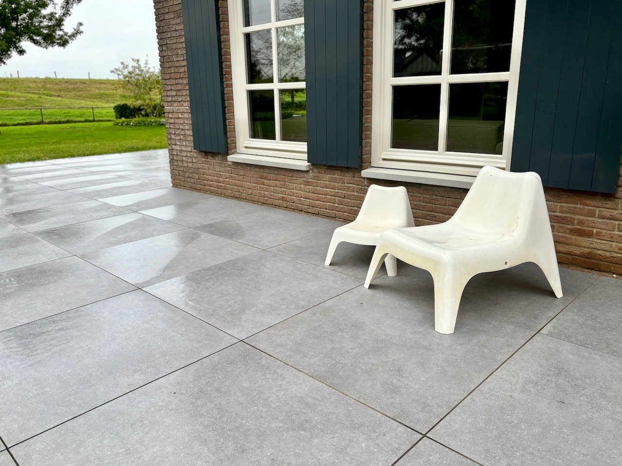 Aan de linkerzijde van de woning is een terras gecreëerd met tegels die prachtig aansluiten bij de kleurtonen van de kinderkoppen, wat zorgt voor een harmonieuze en verfijnde uitstraling.