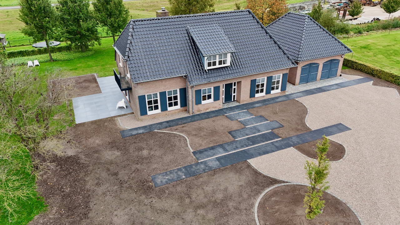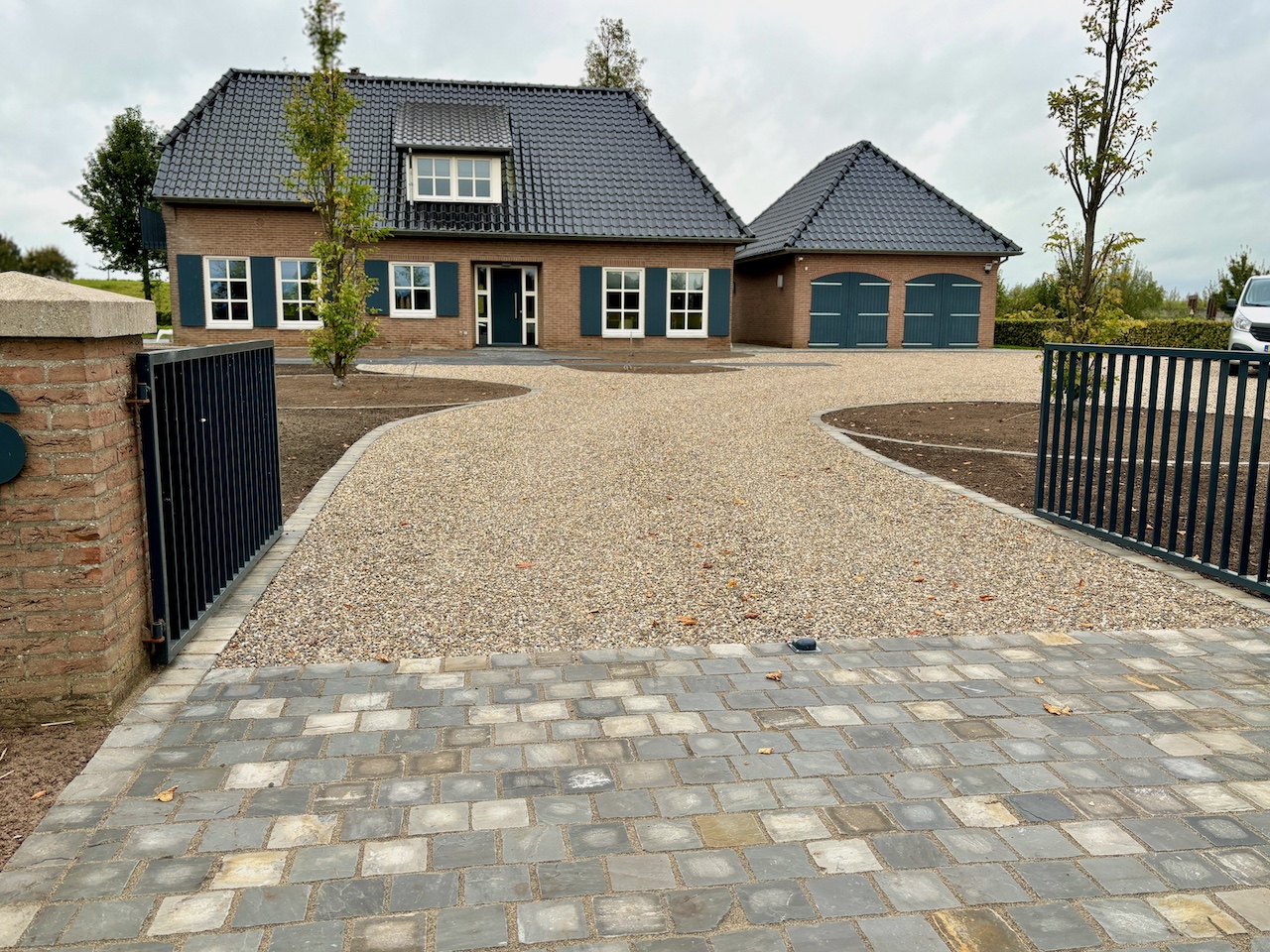 Aan de linkerzijde van de woning is een terras gecreëerd met tegels die prachtig aansluiten bij de kleurtonen van de kinderkoppen, wat zorgt voor een harmonieuze en verfijnde uitstraling.