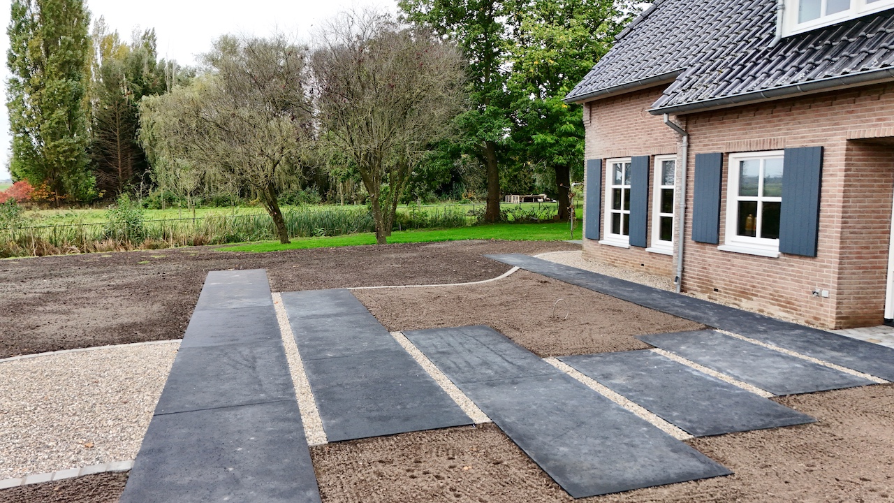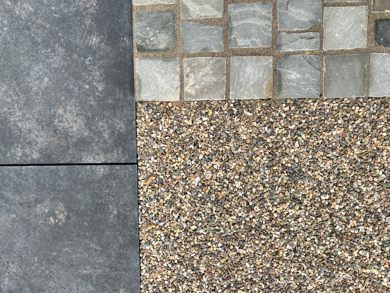 Tussen de woning en de garage komen de Kandla Grey kinderkoppen weer terug, die een klassieke sfeer aan de buitenruimte geven. Deze kinderkoppen zijn ook gebruikt voor de borders, in speelse, ronde vormen, die later gevuld zullen worden met verschillende beplantingen.