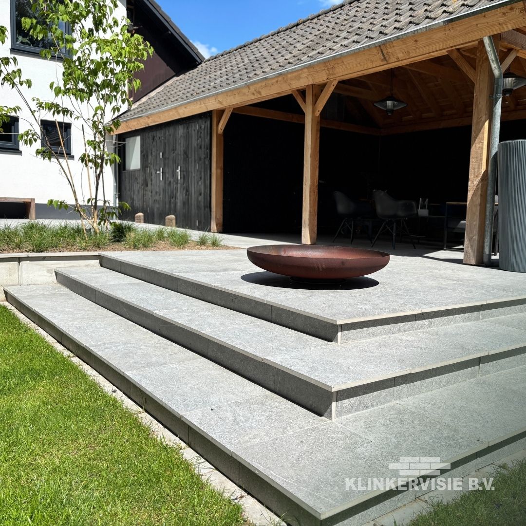 De robuuste traptreden zijn afgewerkt met dezelfde keramische tegels (Livigno Grey) als het terras, wat zorgt voor een vloeiende overgang en een strak, samenhangend geheel.