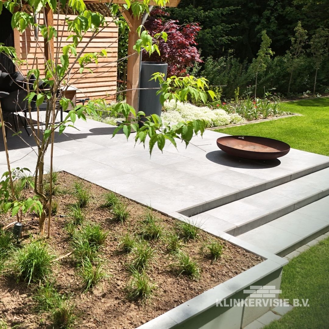 Voor dit project leverde Klinkervisie de materialen die samen zorgen voor een luxe en tijdloze uitstraling. Het verhoogde terras is opgebouwd met stevige keerwanden, ideaal voor het opvangen van hoogteverschillen en extra stabiliteit in de tuin.
