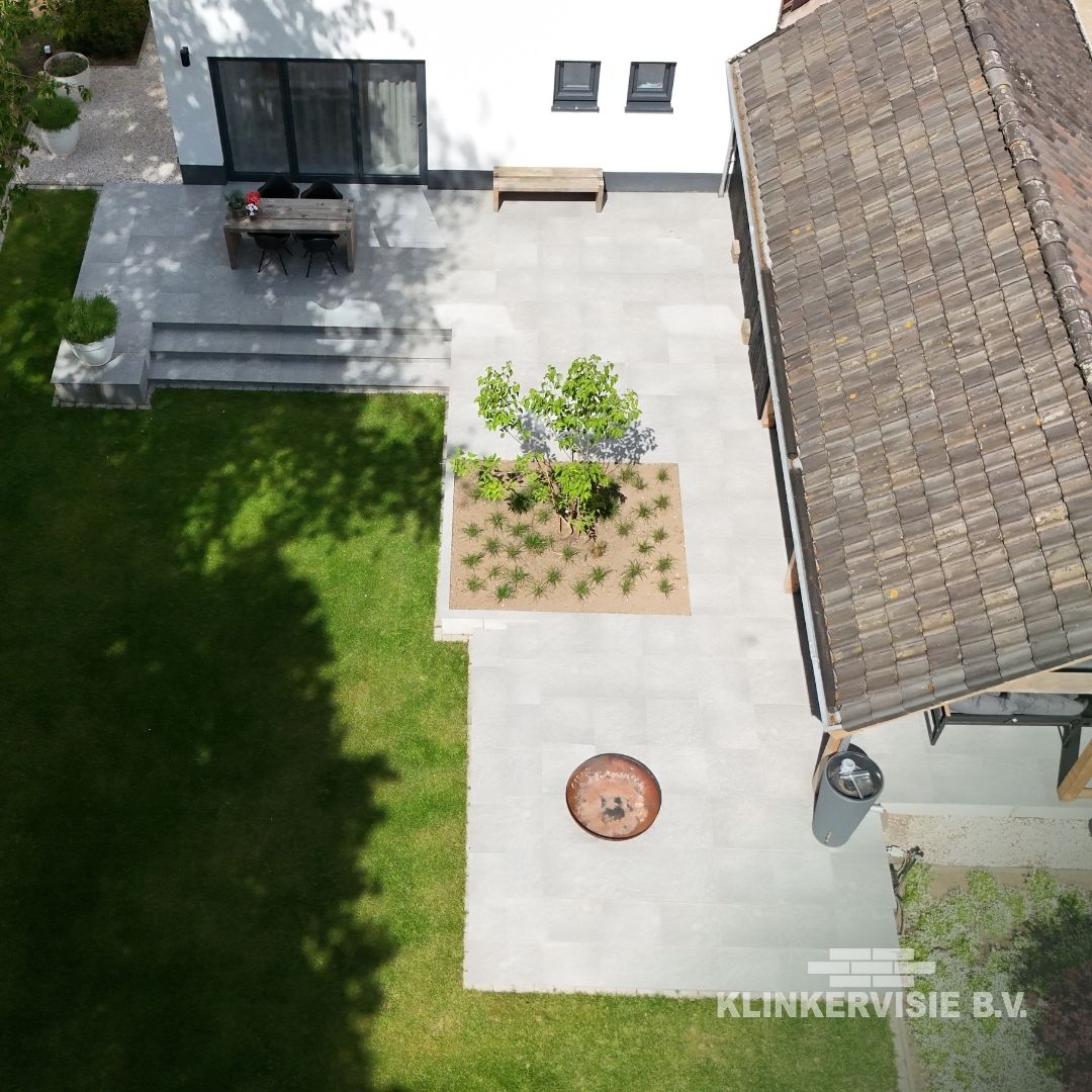 Voor dit project leverde Klinkervisie de materialen die samen zorgen voor een luxe en tijdloze uitstraling. Het verhoogde terras is opgebouwd met stevige keerwanden, ideaal voor het opvangen van hoogteverschillen en extra stabiliteit in de tuin.