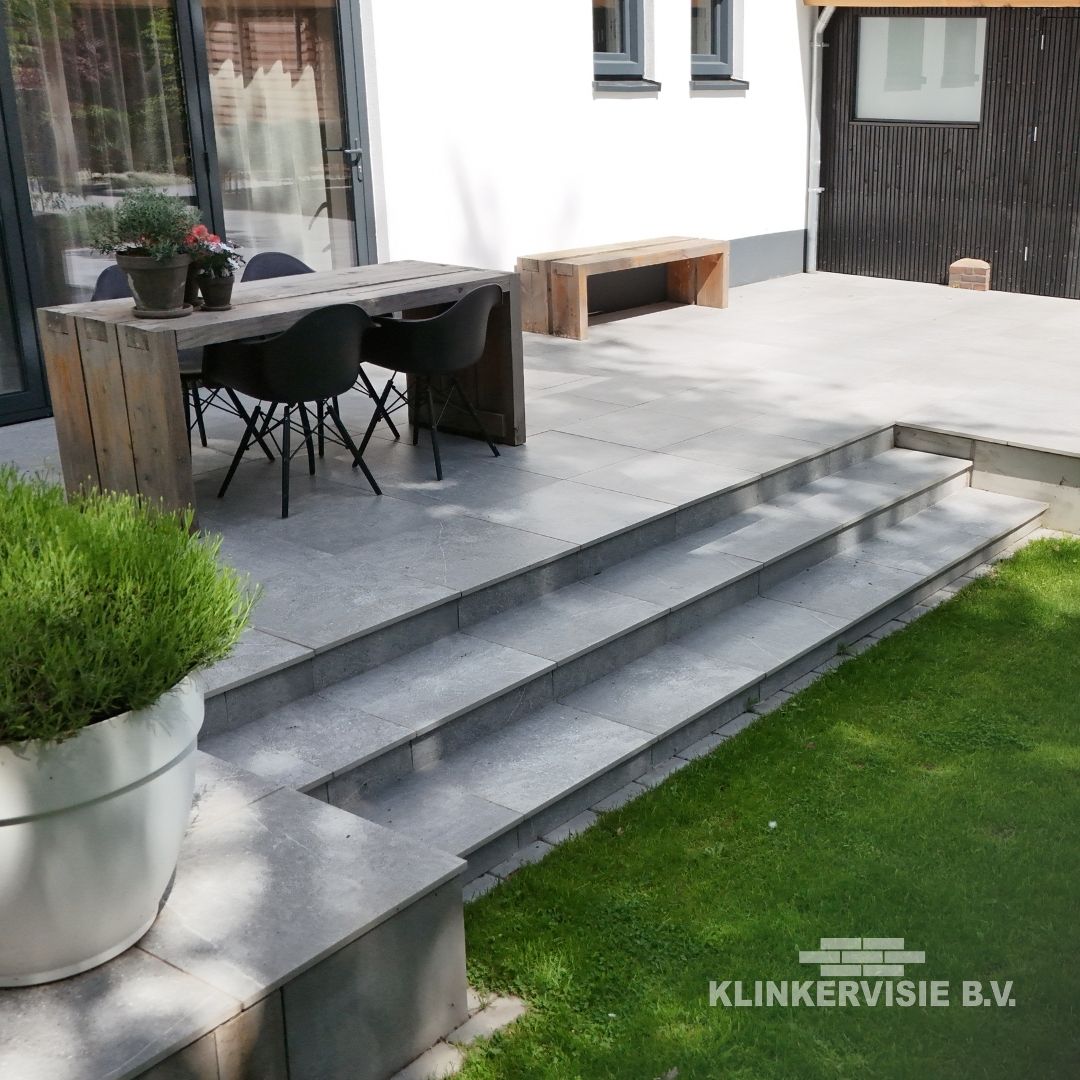 De robuuste traptreden zijn afgewerkt met dezelfde keramische tegels (Livigno Grey) als het terras, wat zorgt voor een vloeiende overgang en een strak, samenhangend geheel.