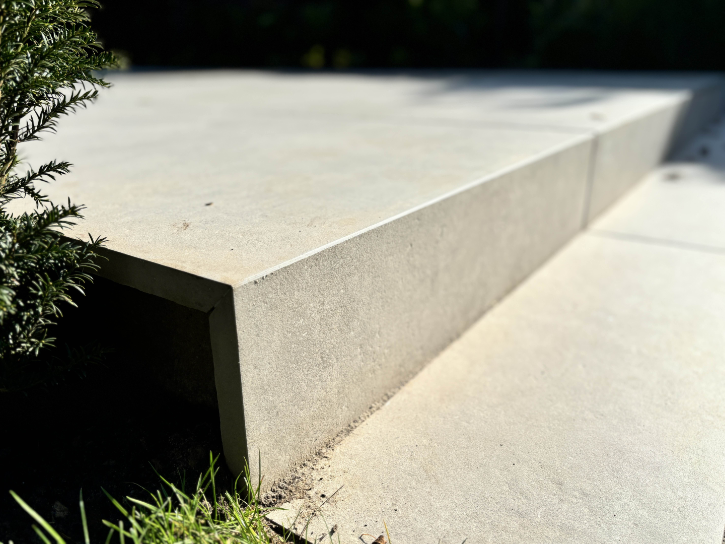De Robusto Ceramica tegels zijn op maat gezaagd in verstek om een mooi afgewerkt verhoogd terras te creëren. De keramische tegels zorgen voor een moderne, strakke uitstraling. - Opsluitband SansVue