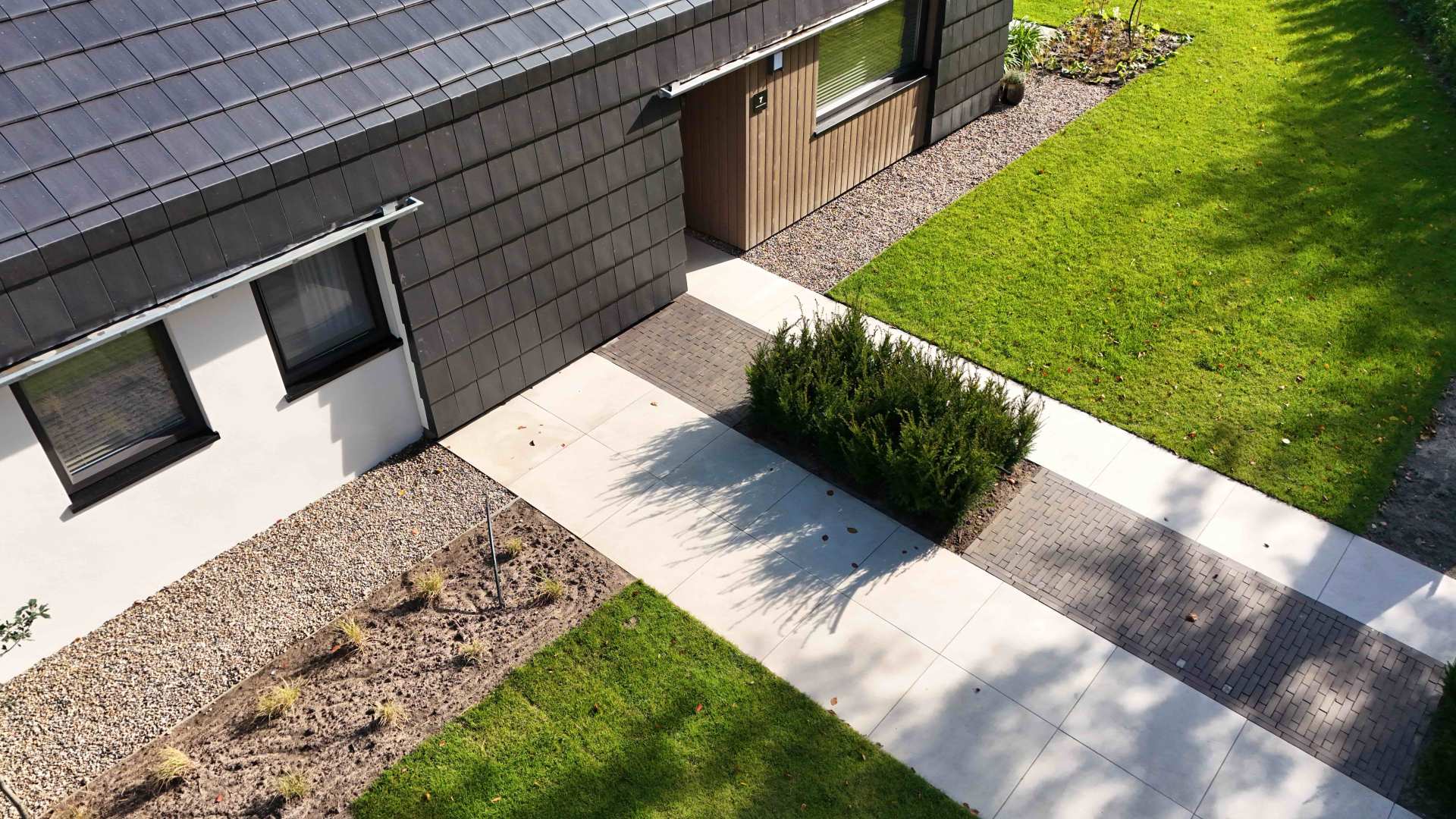 Rondom de woning ligt Japans Split, een natuurlijke bodembedekker die zorgt voor een goede drainage. De siersplit met bonte kleuren gaat mooi samen met de keramische tegels en de UWF62 Vanta Black. - Waalformaat Vanta black in dubbel visgraadverband