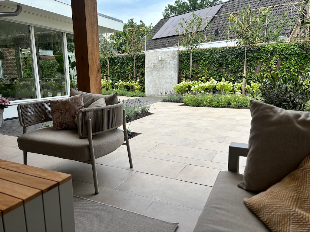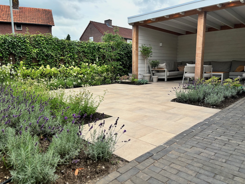 De gekozen "Lucca Anita" gebakken dikformaat in een zwarte kleur zorgen voor een warm welkom. Het klinkerpad geeft de woning charme. Aansluitend aan de oprit is gekozen voor verschillende groenperken met daarbij zandkleurige keramische tegels van 40x80x2. De keramische tegels zijn duurzaam, onderhoudsvriendelijk en bestand tegen verschillende weersomstandigheden. Een mooie keuze voor deze buitenruimte. De bestratingsmaterialen die gebruikt zijn voor de oprit komen terug in de achtertuin en zorgen voor een luxe uitstraling in combinatie met het groen.