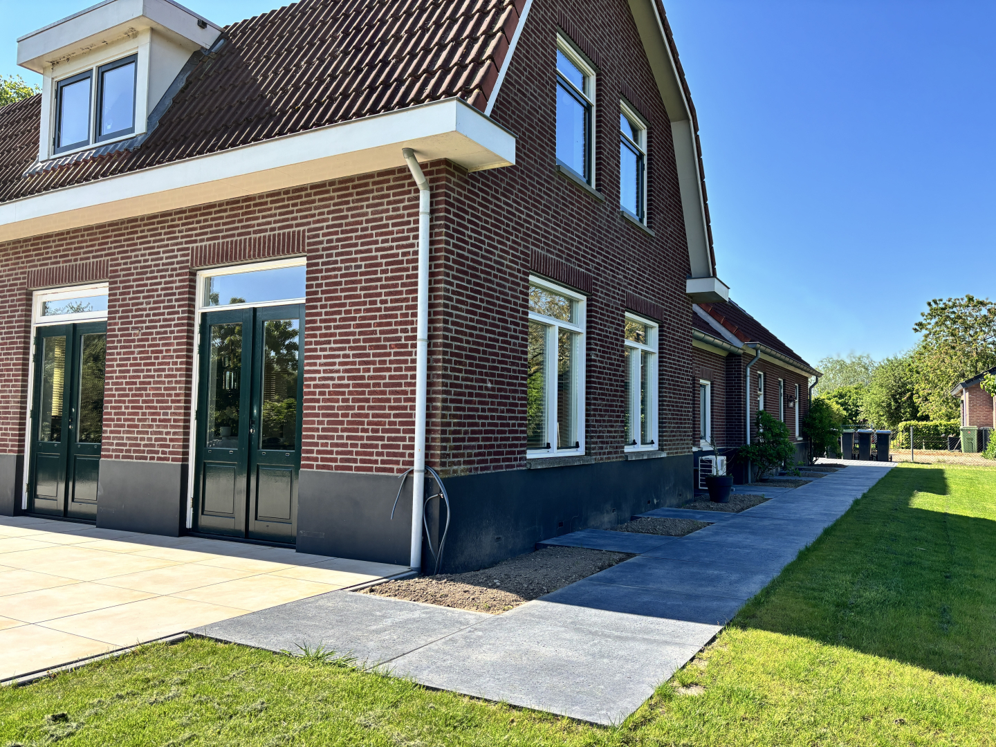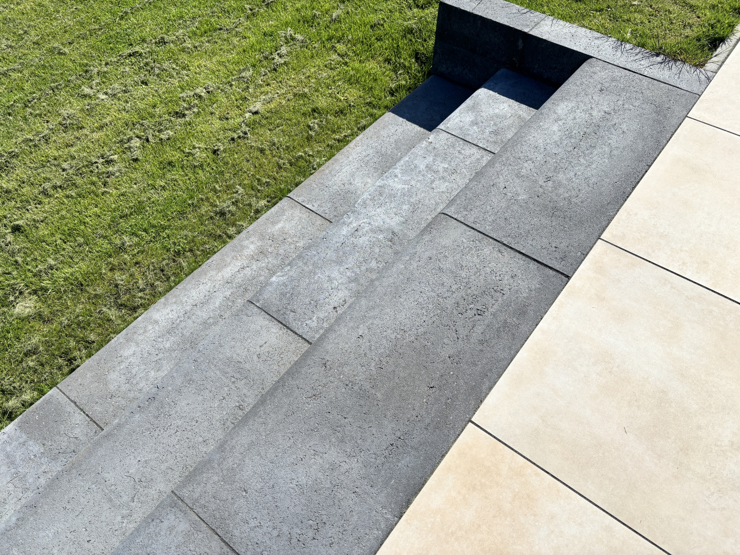 Hoewel de overkapping op het achterterras nog geplaatst moet worden, laat de bestrating nu al zien hoe goed het contrast werkt tussen de verschillende materialen en kleuren.