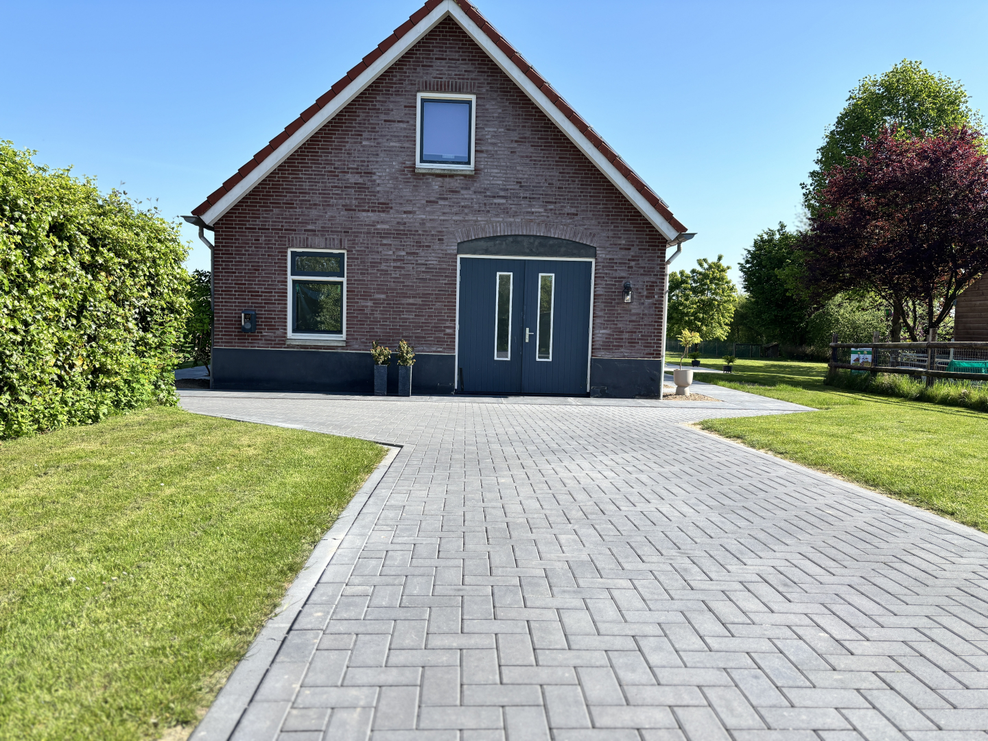 Hoewel de overkapping op het achterterras nog geplaatst moet worden, laat de bestrating nu al zien hoe goed het contrast werkt tussen de verschillende materialen en kleuren.